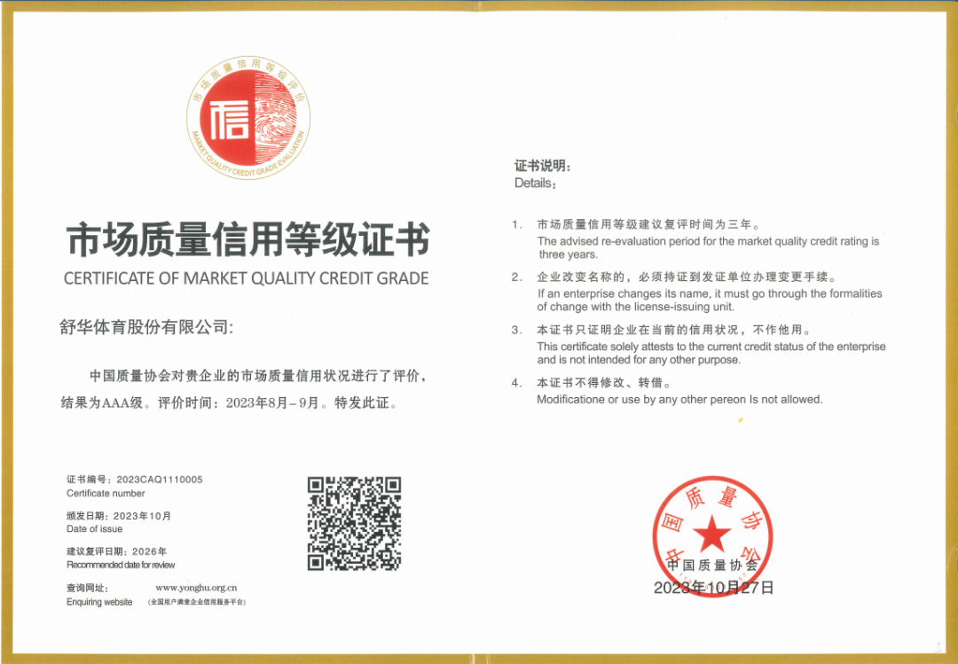 ? ? ? ?舒華體育此次榮獲市場質量信用AAA級企業,不僅意味著產品質量和品牌口碑,在市場中獲得了廣大消費者的肯定,也代表著企業在形象、公信力和質量品控等方面,獲得權威機構和社會的高度認可。除此之外,今年舒華體育還斬獲“國際知名品牌”、“2017-2023年度標準化工作先進單位”、企業標準“領跑者”、“全國健身器材行業質量領先品牌”、“全國質量檢驗穩定合格產品”等多項殊榮。